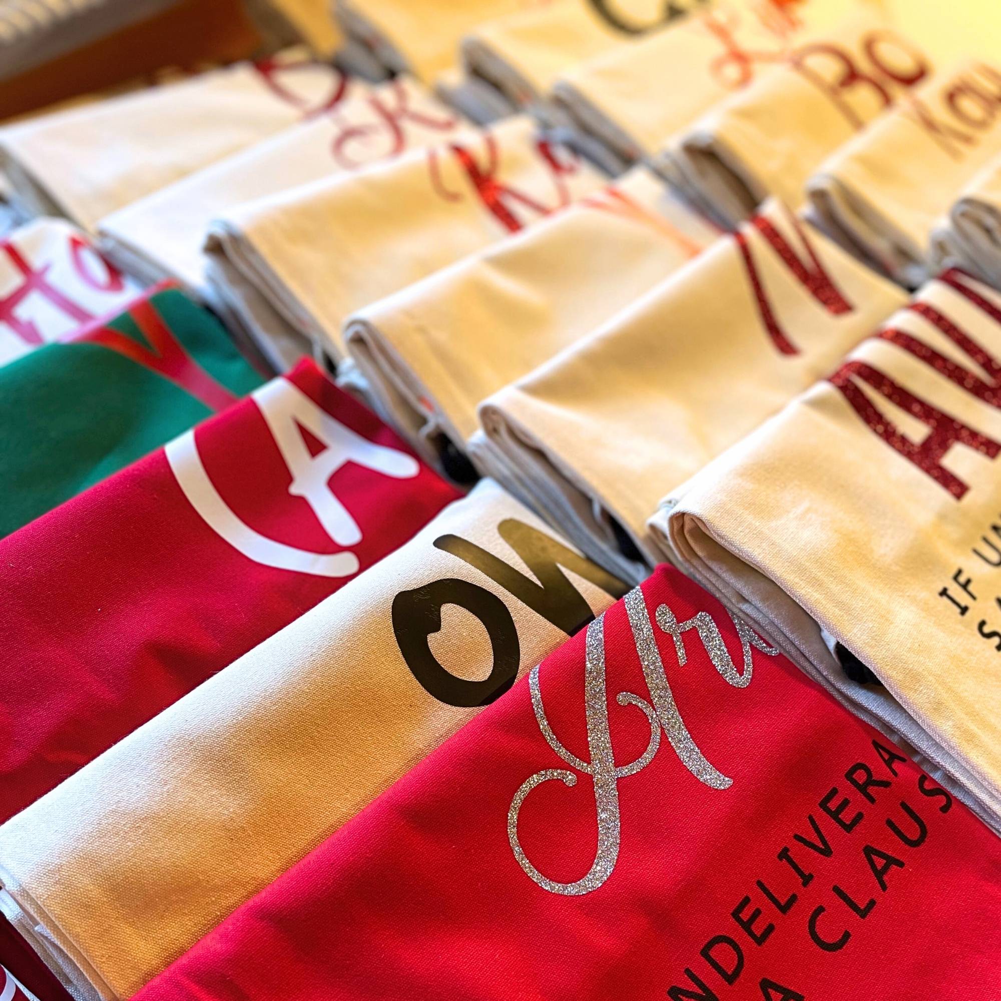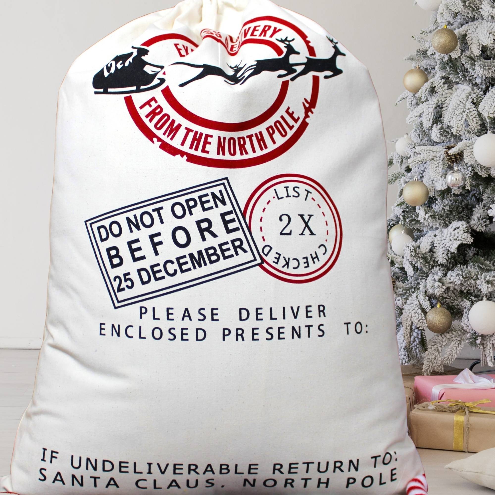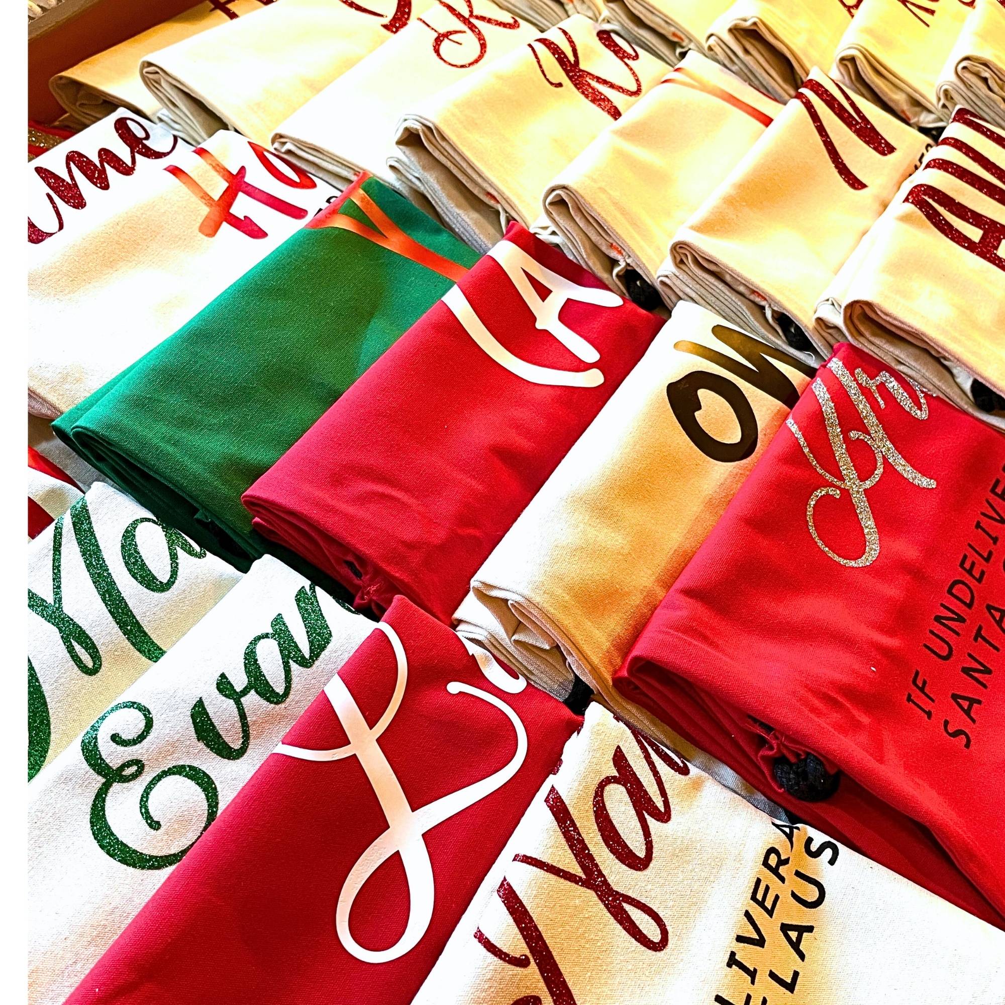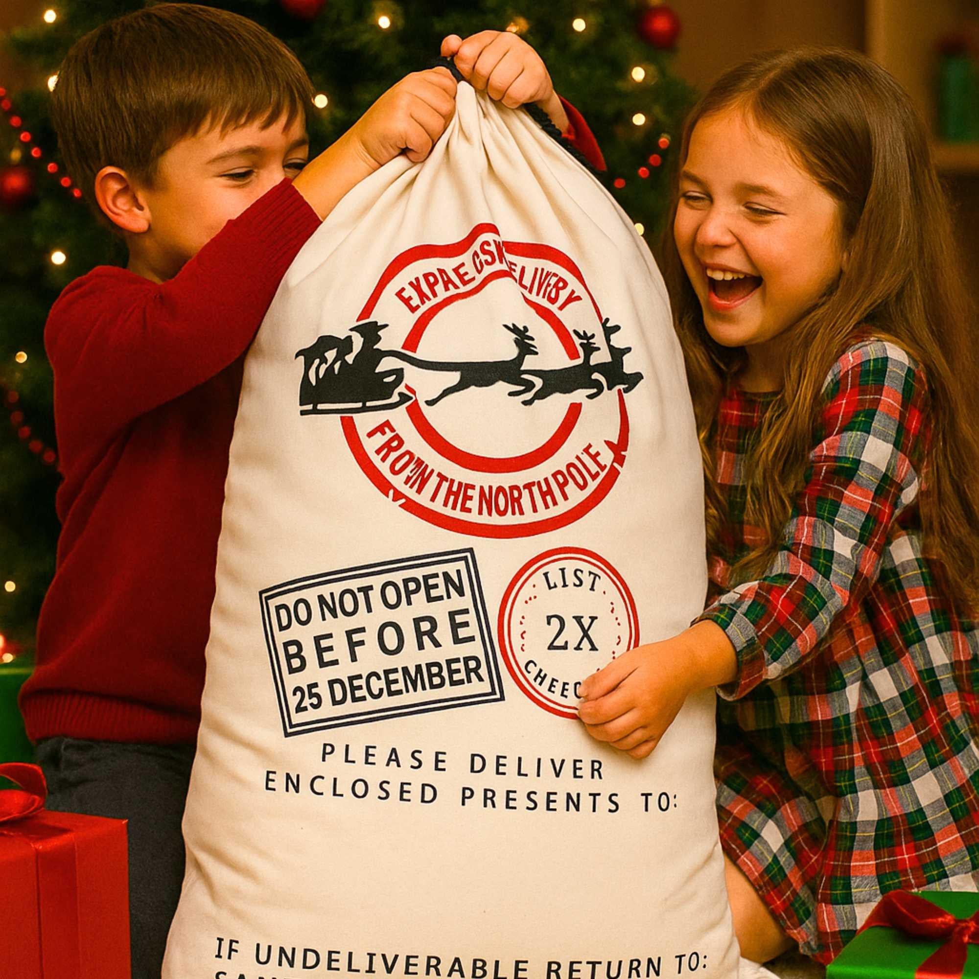 Crafted from durable cotton canvas, this Jumbo Canvas Santa Sack in natural beige offers both practicality and lasting quality. Its large size and easy-to-use drawstring closure make gift-giving simple and stress-free. Each sack is personalized with your child’s name using heat transfer and glitter vinyl, adding a sparkling touch that creates Christmas morning magic. Designed to be a sustainable family keepsake, this cherished gift brings joy to kids and parents alike, becoming a treasured part of holiday traditions for many years.